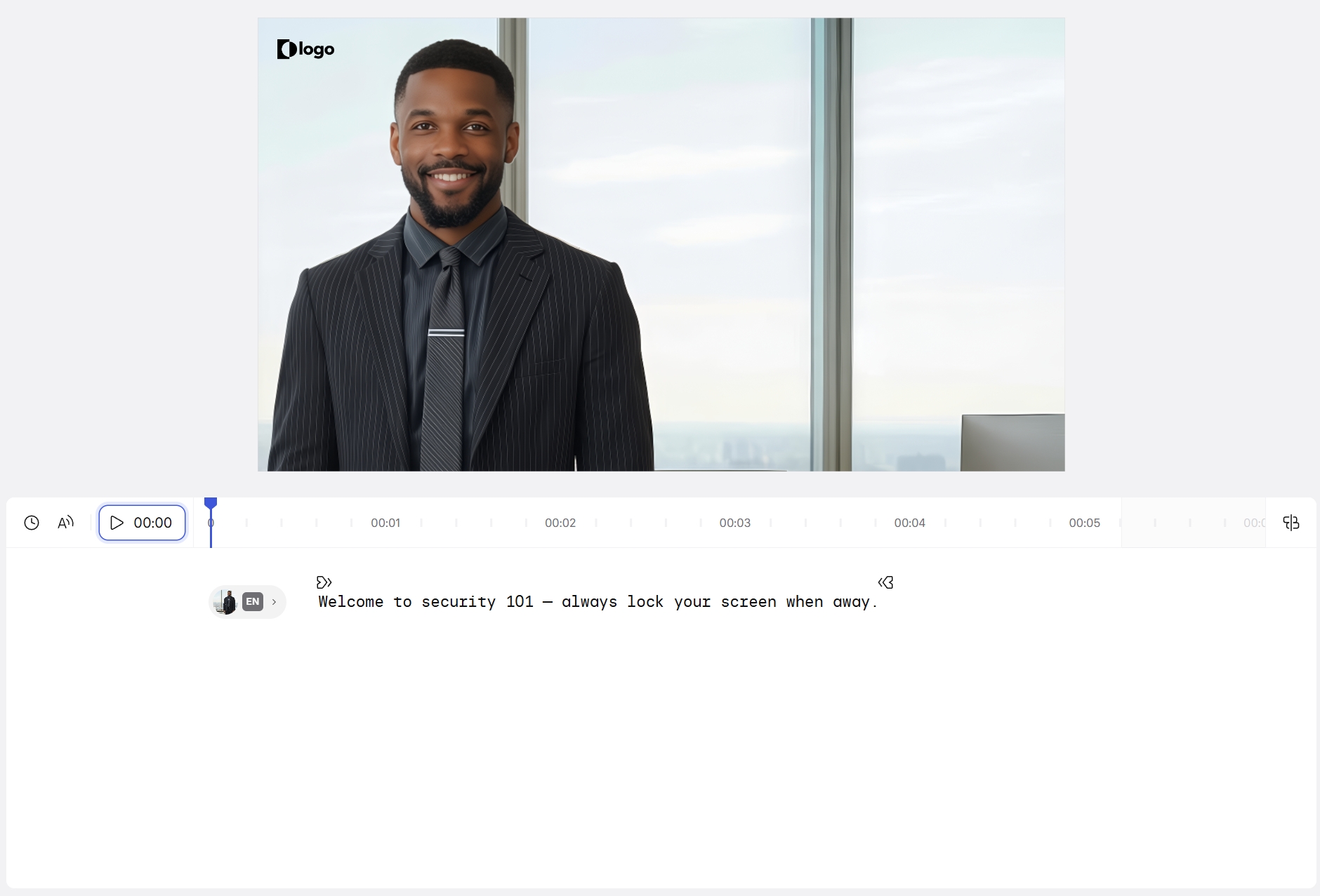 • Select voice & language; enable captions and apply brand kit when relevant.