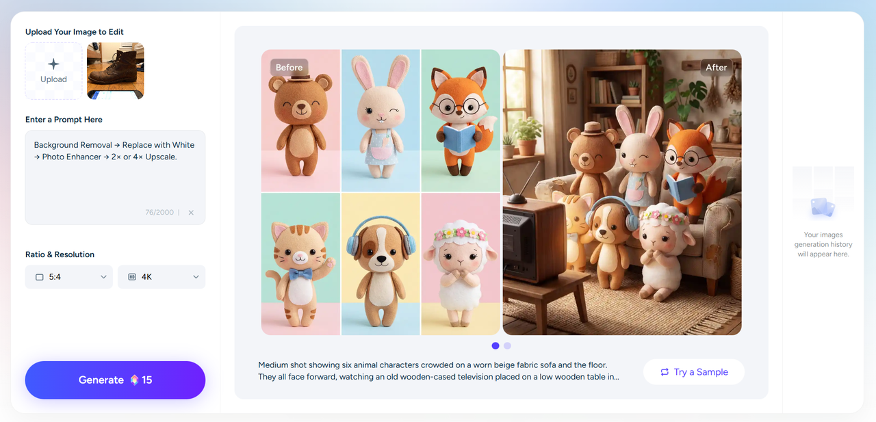 - Edit: Background Removal → Replace with White → Photo Enhancer → 2× or 4× Upscale.