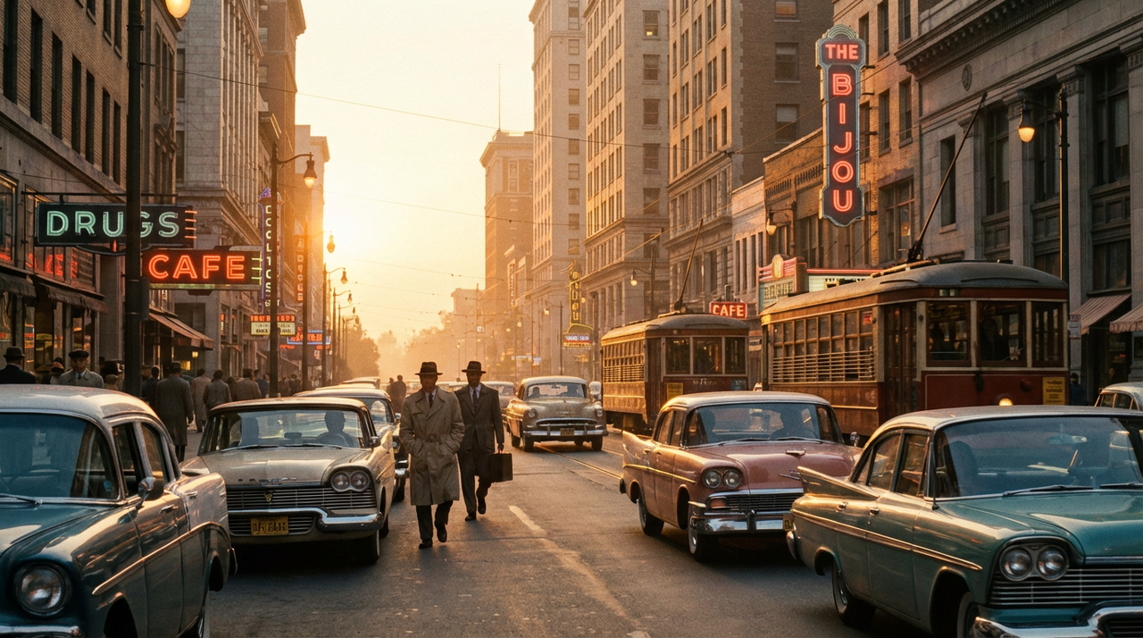 - Prompt: A vintage 1950s city street at sunset, cinematic wide shot, film grain, Fujifilm 400 Expectation: Stylised, film-like city scenes with warm tones and grainy texture. Tweak & retries: Added “cinematic wide shot” on run 2 to improve composition. 2 runs.