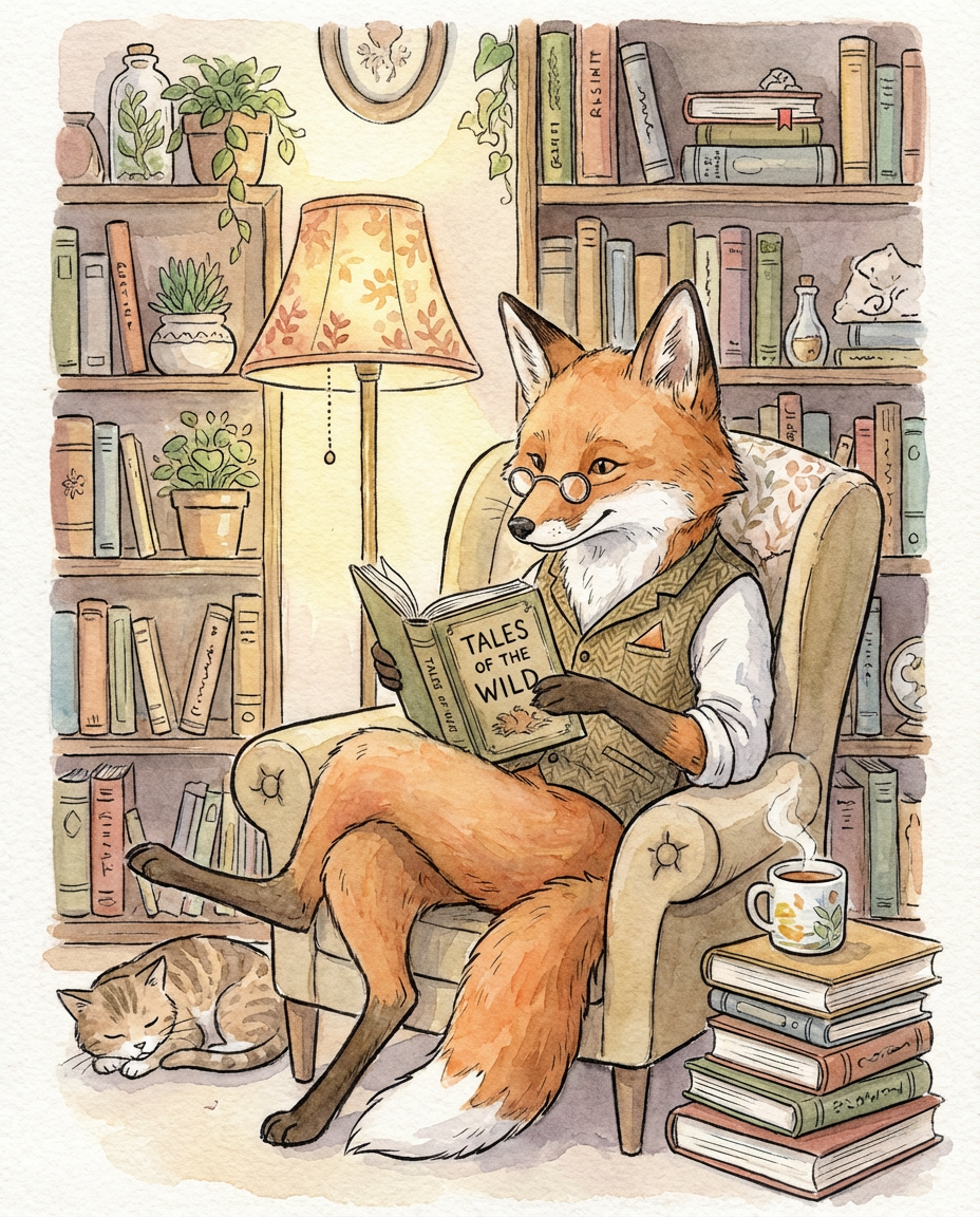 - Prompt: A whimsical fox librarian reading under a lamp, children’s book illustration, watercolor Expectation: Cute, illustrative characters with soft, painterly textures. Tweak & retries: On run 3 I added “cozy interior” to get more background detail. 3 runs.
