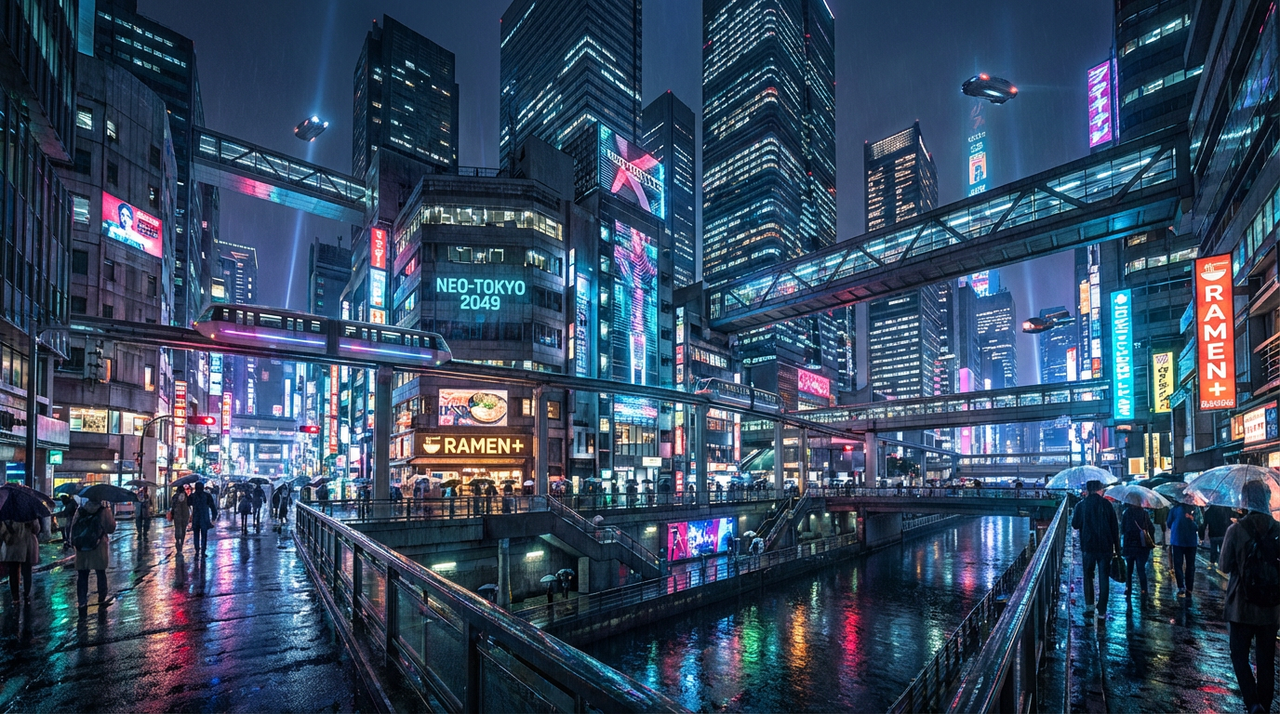 - Prompt: Futuristic Tokyo skyline at night, neon reflections, ultra wide angle Expectation: Dramatic urban landscape with reflections and neon glow. Tweak & retries: Adding “high detail” tightened structures on run 2. 2 runs.