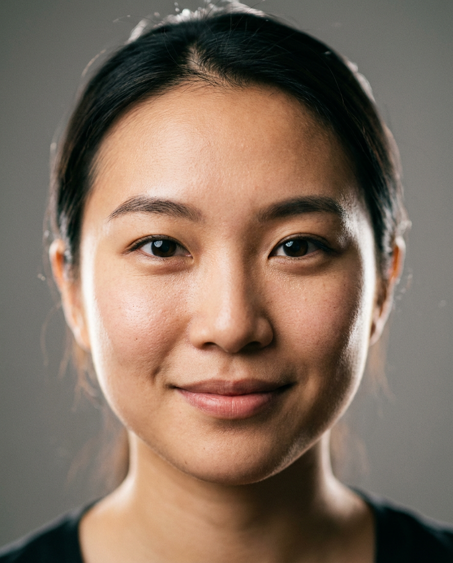 Prompt: Headshot of a confident young Asian woman, studio lighting, shallow depth of field, 85mm portrait, soft rim light, neutral gray background, ultra-realistic skin detail, film grain