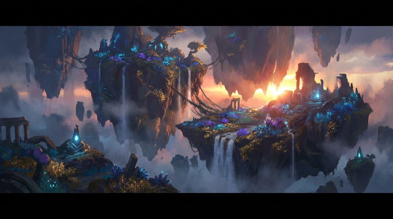 Prompt: Epic twilight fantasy landscape, floating islands, bioluminescent flora, cinematic wide shot, dramatic rim light, volumetric fog, 35mm, ultra-detailed, painterly concept art