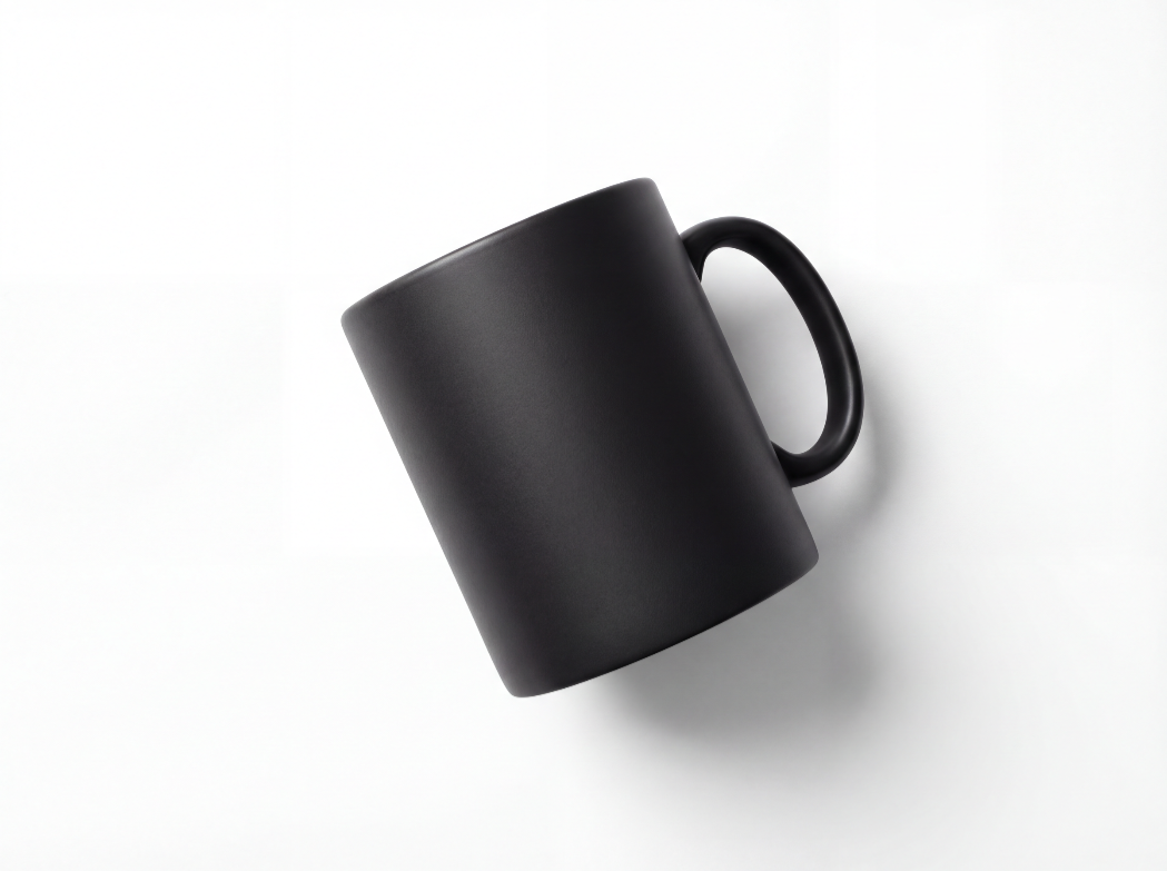 Prompt: Minimalist product photo of matte-black ceramic mug on white seamless background, top-left softbox, drop shadow, 45° angle, 4k detail, studio retouching