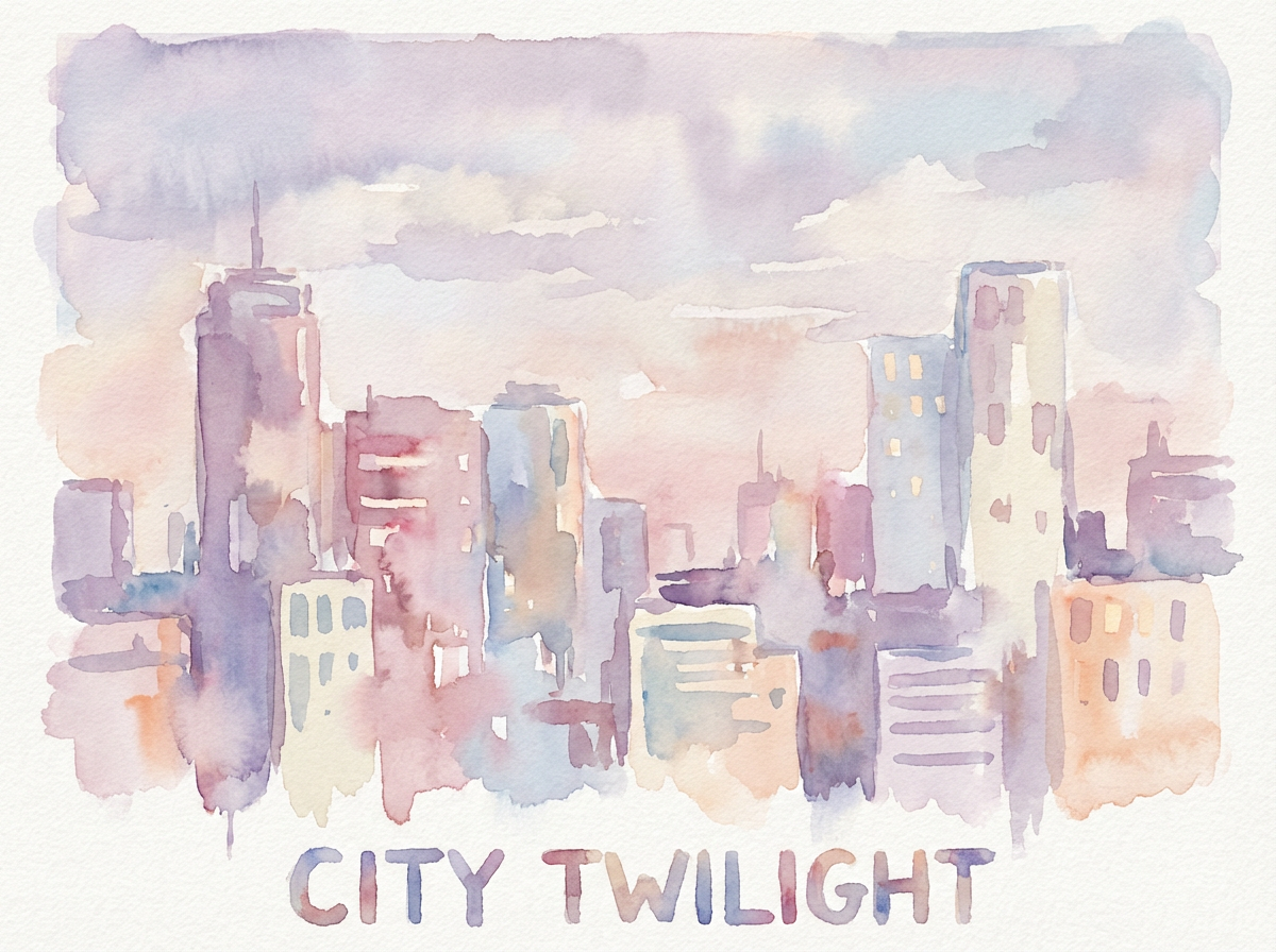 Prompt: Watercolor poster of a city skyline at dusk, loose brush strokes, pastel palette, paper texture visible, soft edges, high stylization