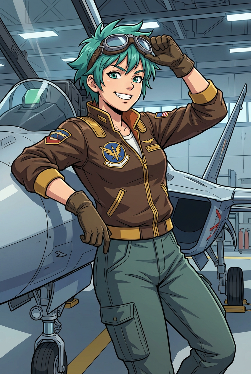 Prompt: Anime character — energetic teen pilot, short spiky teal hair, flight jacket with gold trim, confident grin, dynamic three-quarter pose, cel-shaded, crisp line art, studio lighting