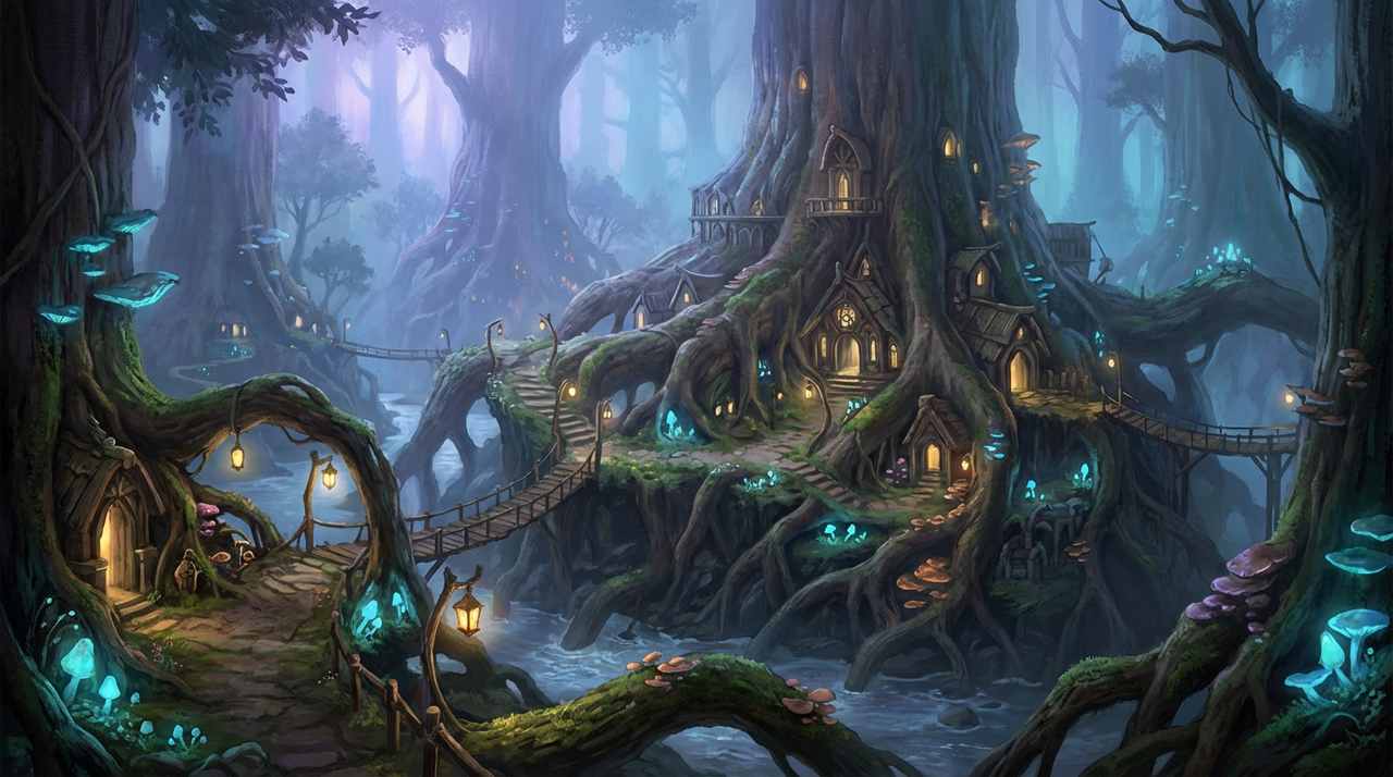 - Prompt: Ancient tree city built into roots, bioluminescent lanterns, foggy twilight, wide cinematic composition — highly detailed fantasy illustration