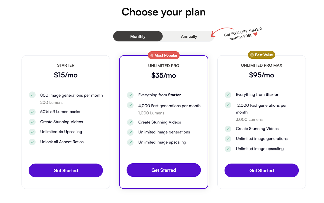 Starry AI uses a mix of free Lumens (credits) and tiered subscription plans (Starter → Unlimited Pro → Unlimited Pro Max). Exact numbers and in-app purchase prices vary by platform and by region, so treat the figures below as examples pulled from official pages and app-store listings.