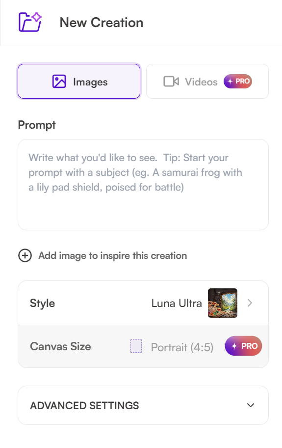 | Aspect ratio & size | Choose square/portrait/landscape; sometimes wallpaper options. |