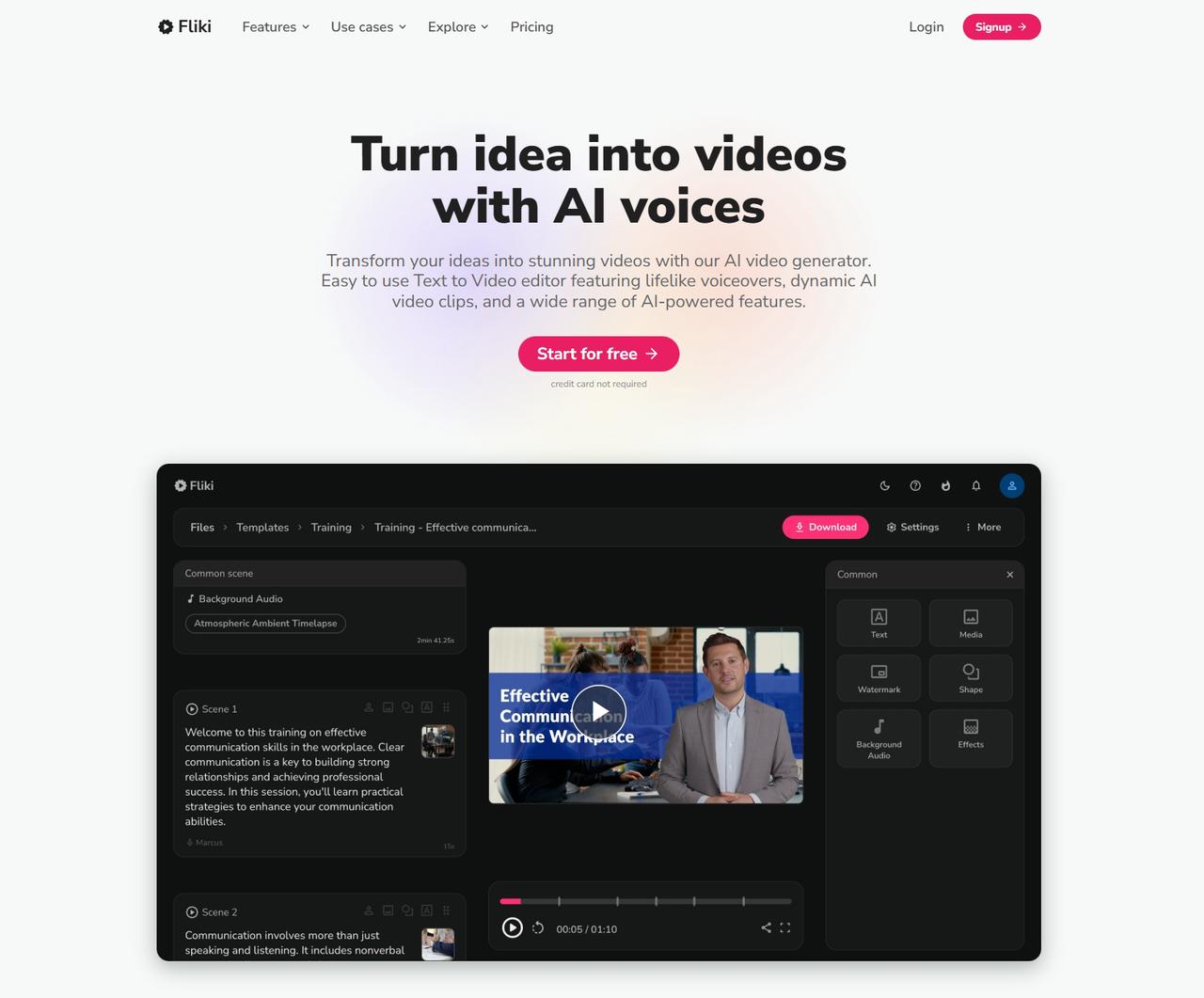 Great for creators who publish lots of short-form videos and need quick, voice-driven output. Fliki handles script → voice → multi-aspect export fast, and the built-in thumbnail maker is a time saver. Main limitation: the AI visuals can be generic — you’ll often swap in brand images and tweak timing in a separate editor for high-polish pieces。