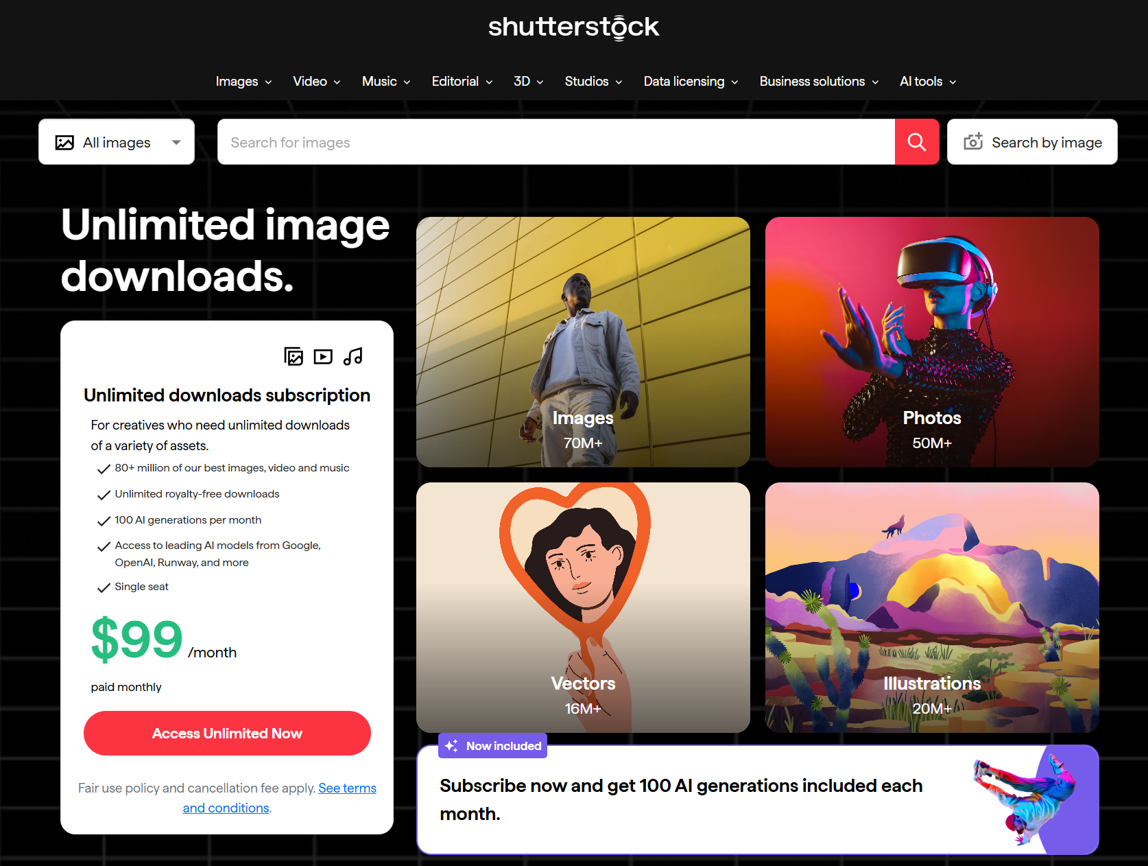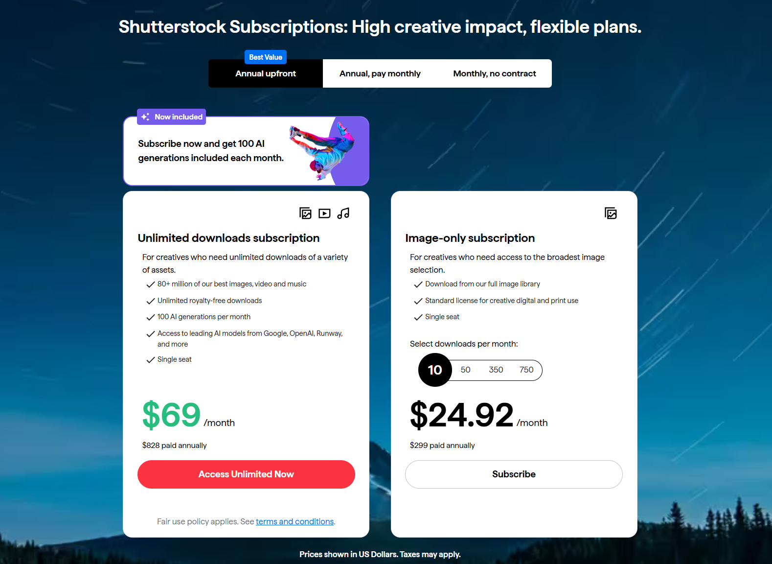 Shutterstock ties generative AI usage to credits and business plans; larger teams or enterprise accounts get more AI capacity and additional features. Pricing and credit models change, so double-check the current tiers on Shutterstock’s pricing pages before you budget for a large campaign. Always check the pricing pages before subscription.
