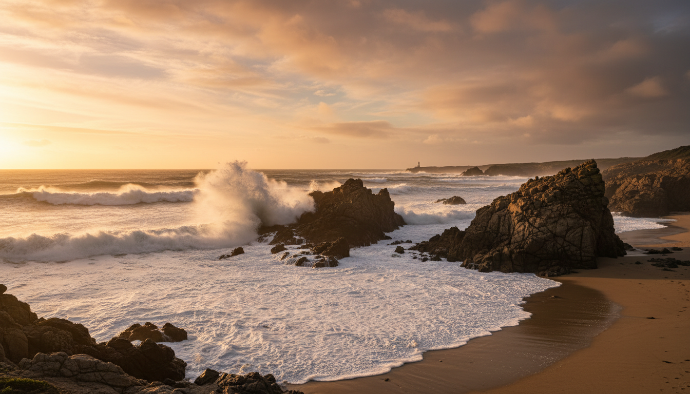 A. Coastal landscape Base prompt: 16:9 dramatic coastal landscape at golden hour, wide-angle, crashing waves, warm cinematic light, soft clouds, high detail. Judgement: Great for landing pages and headers — natural-looking light and believable textures. Minor wave/artifact cleanup in an editor may be needed.