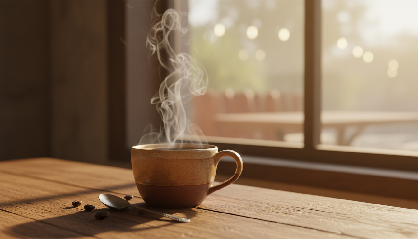 Prompt: 16:9 wide view — close-up of a steaming ceramic coffee cup on reclaimed-wood table, soft morning light through a café window, subtle bokeh, warm tones, ultra-realistic food photography, shallow depth of field, shot on 50mm.