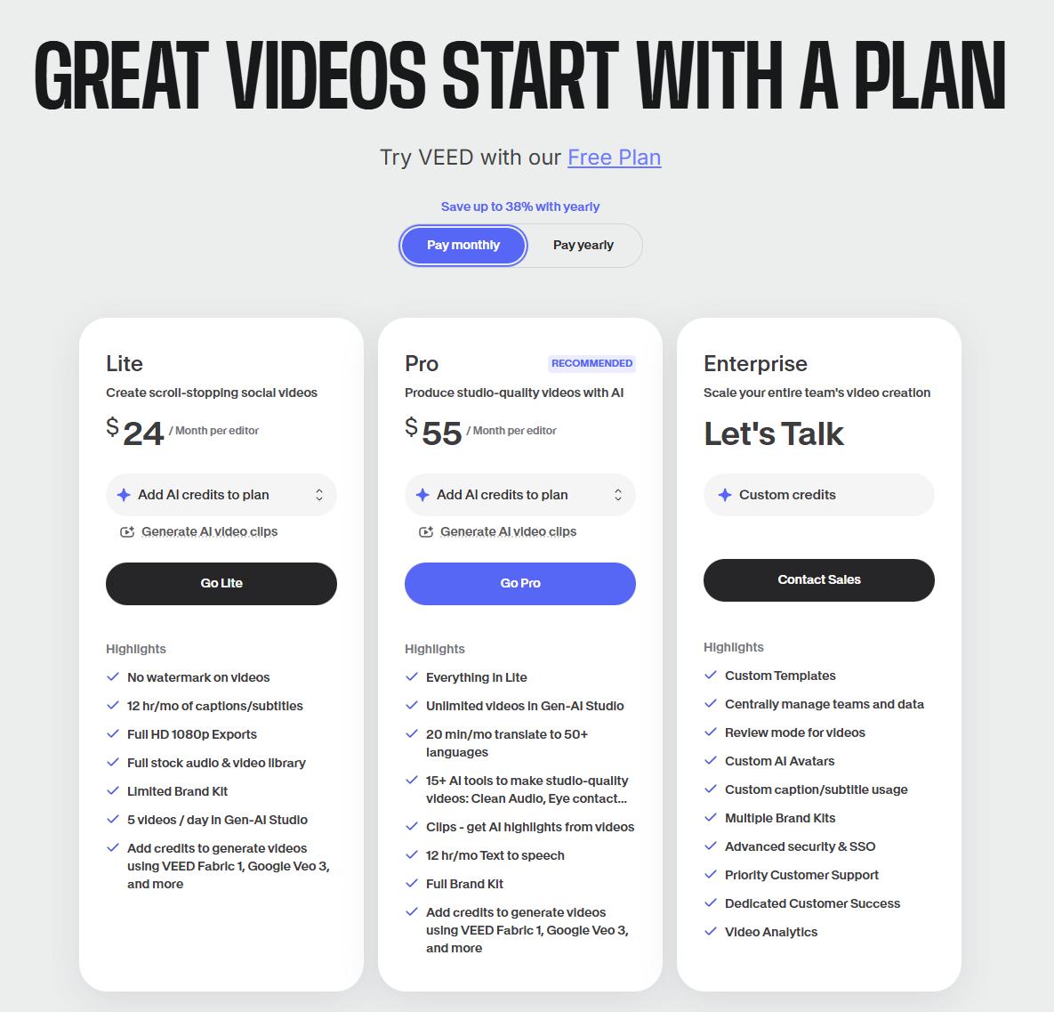 Veed keeps its pricing refreshingly simple in 2025, with three main tiers designed for creators, pros, and teams:
